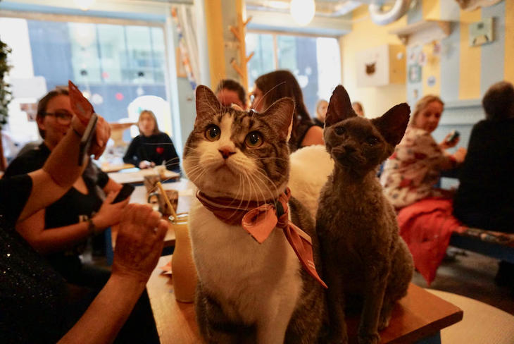 入店時はまずアルコールで手を消毒。そして猫が店から飛び出さないように作られた、2つの扉をくぐり店内へ入ります。客は各自、ドリンクなど何かを注文をする必要がありますが、特にカフェ内での滞在時間は決められていません。店内には猫が喜ぶおもちゃもあります。