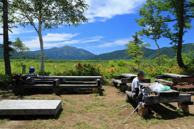弥四郎小屋前のベンチにて、尾瀬ヶ原と至仏山を望みながらランチタイム♪
