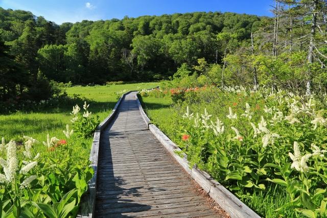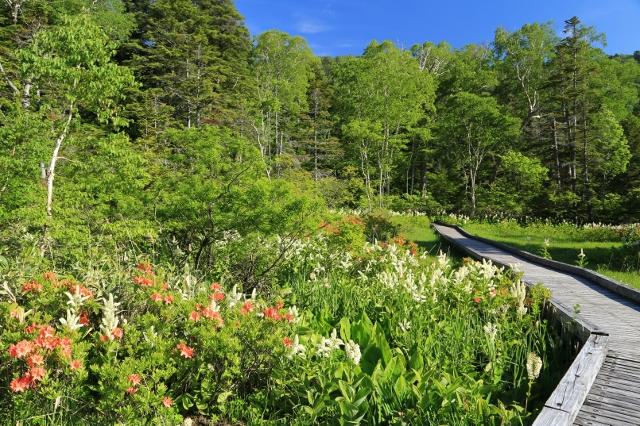 登山口近くの御池田代では、コバイケイソウやレンゲツツジが見頃を迎えていました。