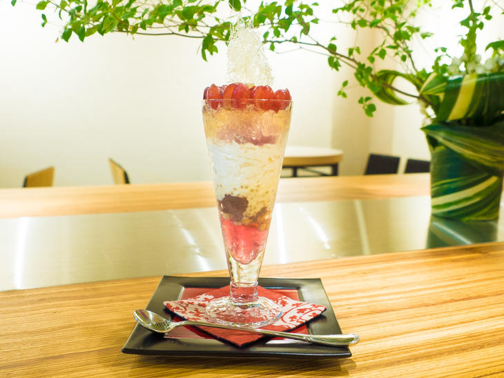 そして、こちらが旅の一日の"シメ"に楽しんでいただきたい「ぶどうの花パフェ」(¥1,380)。