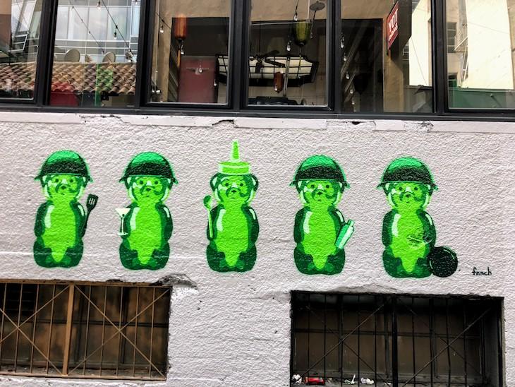サンフランシスコのダウンタウンに程近いベルデン通り(Belden Place)の小さな路地にあるのが緑の兵隊風ハニーベア。ヘルメットを被ったハニーベアはそれぞれ調理器具を持っています。