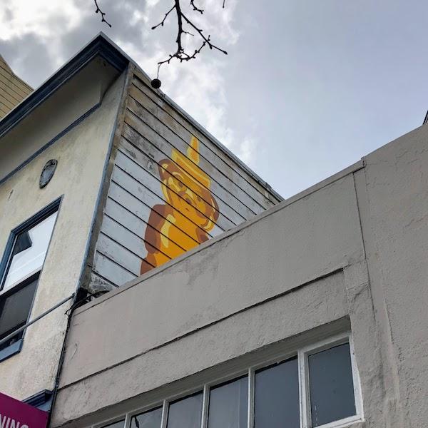 まずご紹介するのが、隠れ壁アートとして親しまれているディビ通り(Divisadero St)にある彼の作品。こちらは、アラモスクエアからも程近いゴールデンゲート通り(Golden Gate Street)とターク通り(Turk Street)の間にある建物の2階部分にペイントされています。
