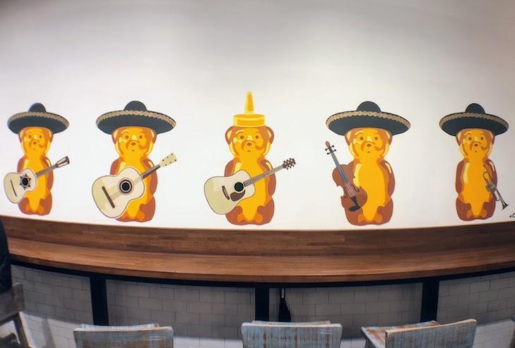 ロウワーノブヒル(Lower Nob Hill)にあるカリフォルニア風メキシコ料理を出すグルメファストフードレストラン「チズメ・カンティーナ(Chisme Cantina)」の店内にはメキシコの伝統的な音楽を奏でるマリアチ(mariachi)と呼ばれる音楽隊に扮したハニーベアが描かれています。