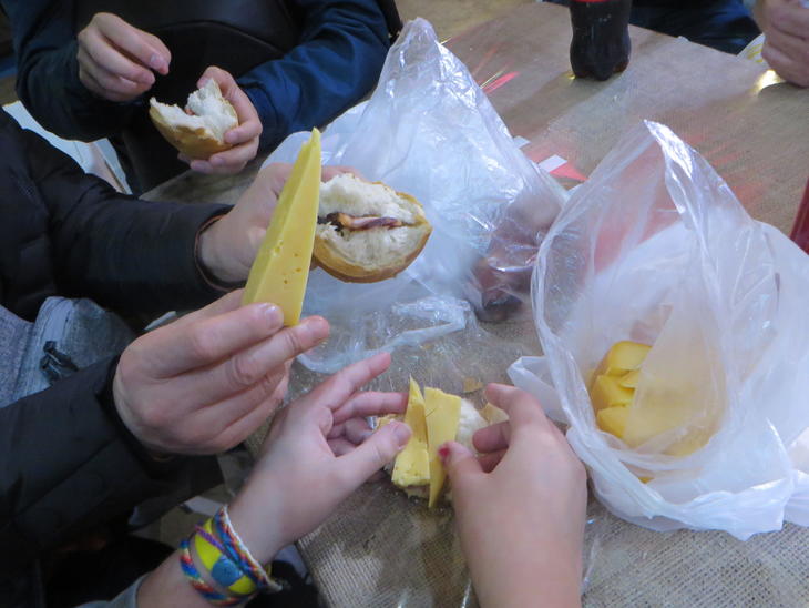 四人で、サラミとチーズとパンで305ペソ。(約10ドルです)使いました。ちなみにハムとチーズのフランスパンサンドイッチは一つ100ペソで売っています。 ですから四人だと400ペソになりますが、合計で100ペソお得で。。。。
