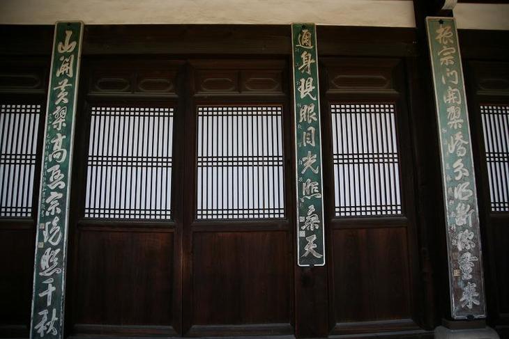 「斎堂(さいどう)」の前です。ここに吊り下げられているのが、魚の形をした大型の木魚で開板(カイパン)。