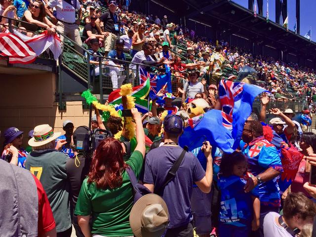 客席の水色はフィジー(FIJI)の大応援団。 フィジーに限らず応援団もお祭り騒ぎで民族衣装や被り物、民族舞踊で応援。