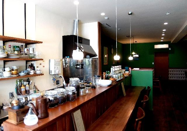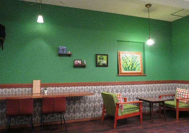 優しい色合いのグリーンな壁によく合うカウンター、テーブル席な感じ。
