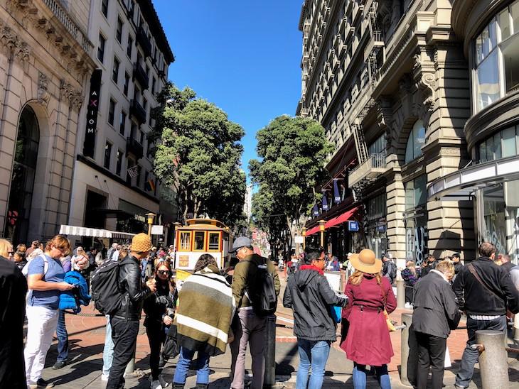 場所は、ケーブルカー乗り場のすぐ近くにあるマーケット通りとパウエル通りが交差する「ハリディ・プラザ(Hallidie Plaza)」。最も人通りが多い観光エリアになります。