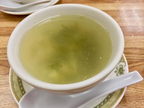 注文すると必ず出てくる『食前スープ』(勝手に命名) いわゆる "お通し" みたいなものだ。 ホット&サワースープ(酸辣)がよく登場するけど、ここは塩味スープに刻んだ菜っ葉が入っててすきっ腹に優しく案外美味しい、ここいいかもしれない。