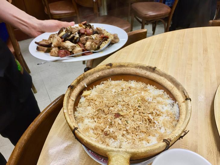 これは土鍋で炊いた "中国風炊き込みご飯" 隣の丸テーブルの中国人三世代家族が頼んでいた。