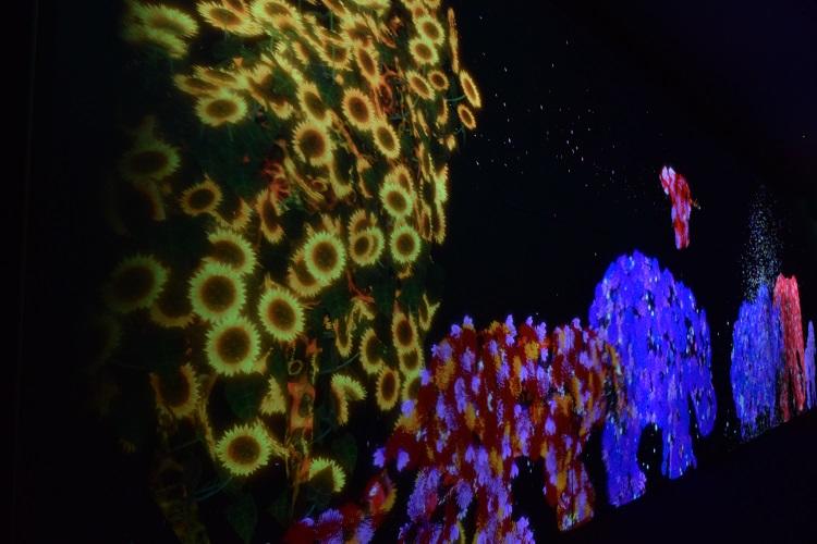 こんにちは。大阪特派員のかおりです。あべのハルカス美術館で開催されている「チームラボ★学ぶ!未来の遊園地」のレポートです。チームラボとは、全世界でアートを発信しているウルトラテクノロジスト集団です。代表の猪子さんは徳島出身なので、徳島に住んでいたときはチームラボのイベントがかなりあり、講演にもしばしば来られました。あべのハルカスのB1Fにあるシャトルエレベーターで16Fまで行きます。入り口前で、チケット購入列と美術館入場列とに分かれています。入ってすぐは「花と共に生きる動物達」。ゆっくりとゾウやキリンが進んで行きます。