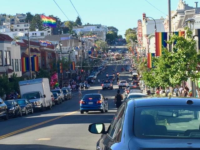 カストロ地区象徴レインボーフラッグは、青空に美しく映え楽しい午後のひと時だった。