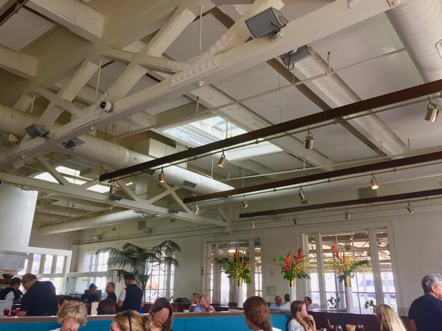 桟橋、倉庫を改造した建物なので、広々とした空間がどんなに混んでいても雑然としてなくて圧迫感なし。 風の通りもよくてランチタイムにも本当いいところだ。