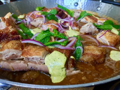 このカラプルクラの起源はコロンブス時代にまで遡る。 ペルーで現存する最古メソティーソ料理(地方料理) インカ帝国時代の料理に “プルカ”と言う強烈に熱した石の上に干したジャガイモを煮込みを作り、アルパカの親戚動物リャマ(LlamaラマLama)の干し肉を加えた煮込んだ料理が元。 スペイン時代に豚肉、牛肉に変わり最近では鶏肉も使われてる。 玉ねぎ、塩、唐辛子、ニンニク、コショウ、クミンとかで味付けしたシチュー。 家庭料理でもあるし宴会用料理でもある。 アンデスの古典的かつ伝統料理をLa Marではそれを見事に洗練された料理として提供している。 値段も見事で79ドルでも、3〜4人で頼んで割り算したらそれほどでもない。 この日のスペシャル料理だったのでいつもあるかどうかは定かではないがもしあったら頼んでみて! ポークベリー皮が薄くパリッと肉自体のジューがジワ〜〜っと、ふんわりとスパイスが効いていてあと引く美味さ。 ピアの外ではカモメが飛んでいるが、アタシたちの気分は “コンドルは飛んでいく♫”