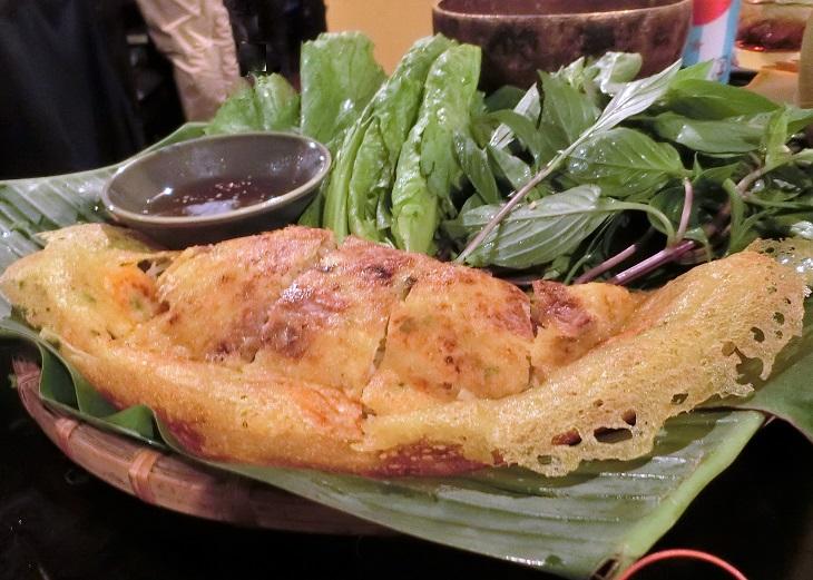 野菜で巻いてヌックマムのタレをつけて食べるので、日本のお好み焼きよりさっぱりしています。