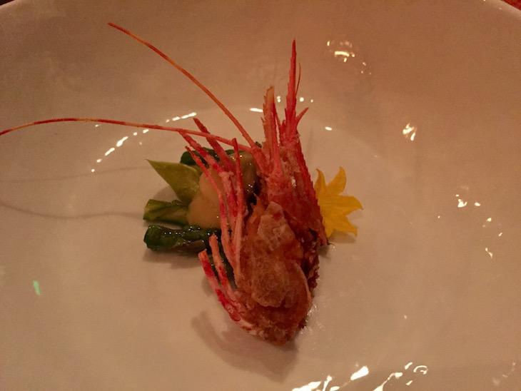 「エビのパフェ」。パリパリの殻はもちろん、エビのお刺身も甘くてプリプリで、こちらも満足です。きゅうりの花って美味しいんですね。知りませんでした。