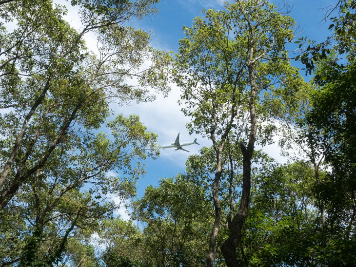 木の葉の間からは、新千歳空港へ向かう飛行機も。