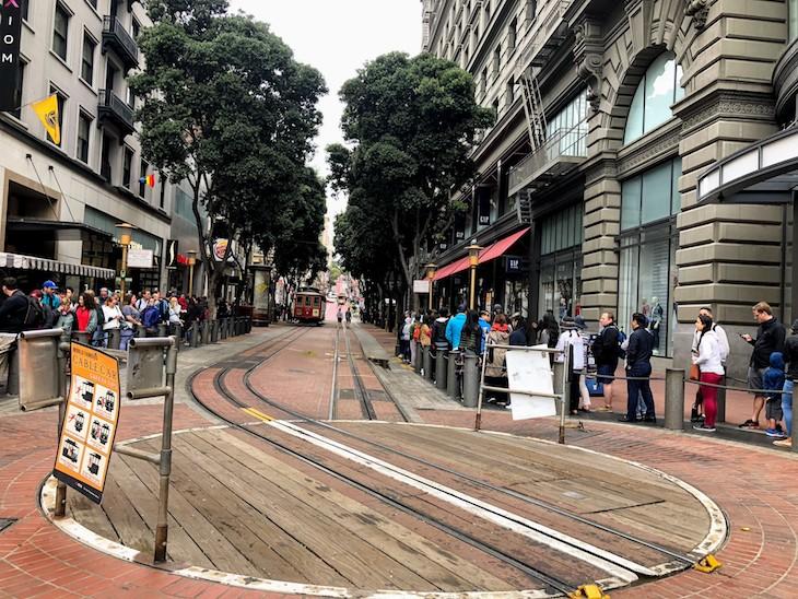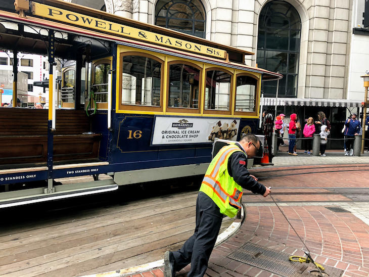 いよいよケーブルカー乗車となりますが、はじめて乗る方であればやはりパウエル通りとマーケット通りにある始発ポイントがおすすめです。ここで待てば、ケーブルカーの進行方向をマニュアルに人力で移動させる様子も写真に収めることができますよ。