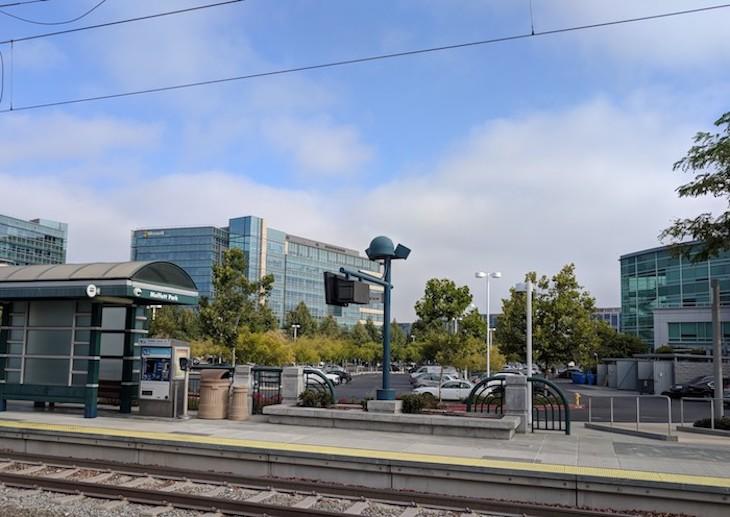 路面電車(Lightrail)のMoffett Park駅に隣接しているGoogle社のTech Center(右側ビル)や遠方にMicrosoft社の研究センター、その先には見えていませんが、Juniper社の社屋があります。