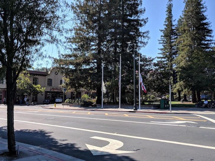 ダウンタウンを眺めながら南下していくうちに、48番のMain & Santa Cruzのバス停のあるダウンタウンの端っこ、The Los Gatos Town Plaza Park(ロスガトス街広場公園)にたどり着きました。バス停が写真左側に小さく写っているのが見えますか?
