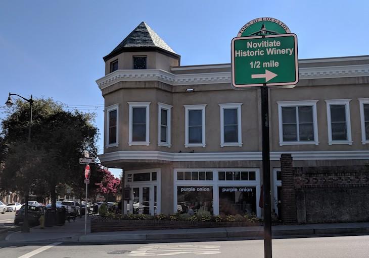 ロスガトスのダウンタウンにたつ道標。Novitiate Historic Wineryと記載されています。