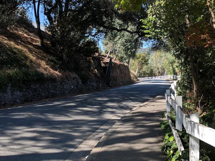 ロスガトスのダウンタウンから歩いてテスタロッサワイナリーに行ってみましょう。ロスガトス街広場公園へ突き当たったところでMain St.を左折して少し歩くと、前方にPurple Onionというカフェが見え、その手前にこの道標が立つ右折道路にたどり着きます。その道路を右折すると坂道に続きます。