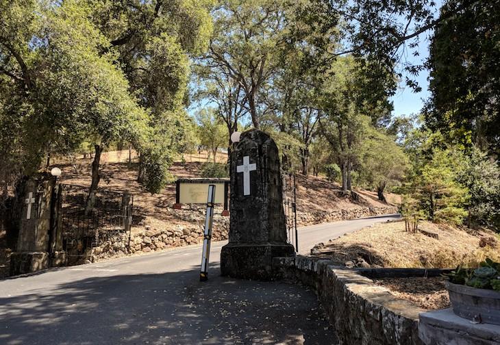 その坂道を道なりに沿ってそのまま歩き続けましょう。先程の道標から0.8キロ先ですから、しばらく散策を続けます。そうすると、十字架のある石門にたどり着きます。テスタロッサワイナリーの入り口です。