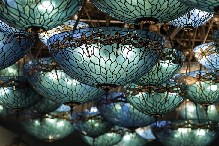今回の店は、2018年5月29日に荷李活道(Hollywood Road)にある旧中環警察署(舊中区警署)などの跡地を文化複合施設として改修してオープンした「大館(Tai Kwun)」の中にあります。店はボヘミアン調のバーラウンジになっていて、19世紀のアール・ヌーヴォーを意識した内装になっています。ジュエリーのティファニーの創業者チャールズ・ルイス・ティファニーの息子、ルイス・カムフォート・ティファニーはアメリカにおけるアール・ヌーヴォーの芸術家として知られていて、現在のステンドグラスのデザイン、色、製法に大きな影響を与えたことでも知られていますが、そう言うところからもヒントを得ています。