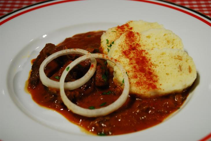 こちらはグラーシュとクネドリーキの組み合わせ。どちらもチェコで一般的な料理です。グラーシュは肉の煮込み料理で、シチューよりもさっぱりとしていて食べやすいです。クネドリーキはチェコ料理を代表する主食で、茹でたパンのようなもの。しっとりもっちりとしていて、やみつきになってしまいます!