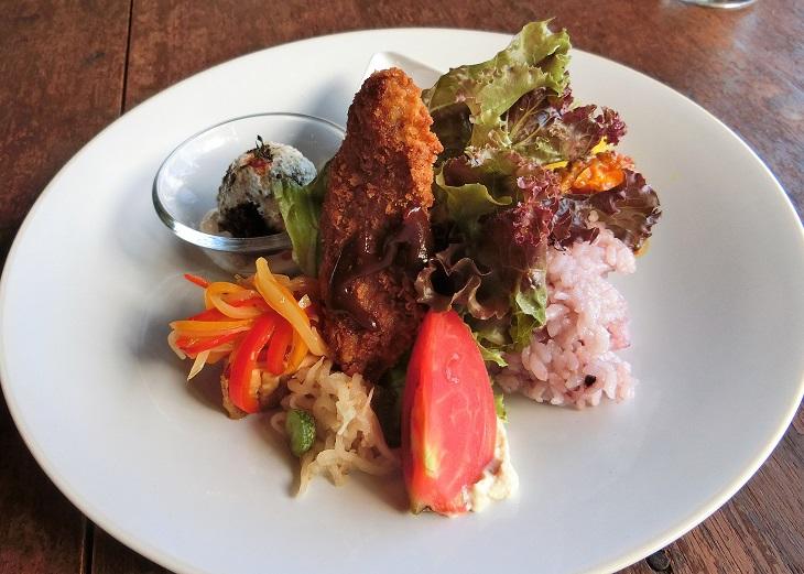 左からガラスの器に入ったキョフテ(ベジのスパーシーミートボール、トルコ風ヨーグルトソース)、厚揚げとパプリカの南蛮漬け、切り干し大根の甘酢漬け、麗夏(れいか)という名のトマト&ピクルスと豆腐マヨネーズのクリーム、赤米が入ったご飯。真ん中にあるのは車麩のフライです。