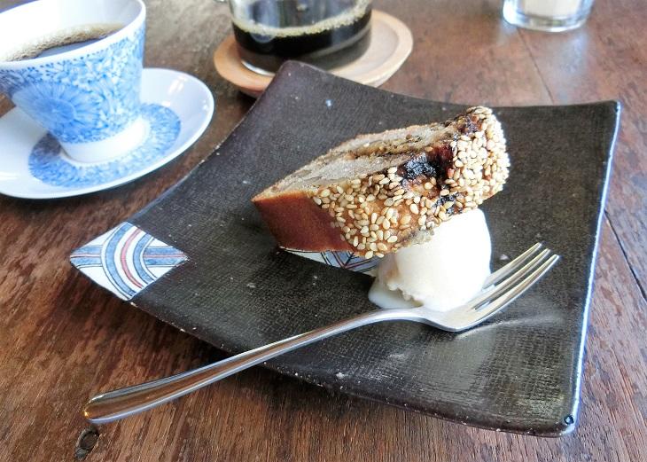 手作りスイーツも魅力的。五平味噌のパウンドケーキ、豆乳のアイスクリーム添え。