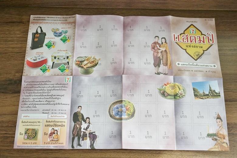 また、シールで集めた金額に応じて、商品と交換することもできます。レジ近くに、シールを貼る台紙が置かれています。台紙には、タイの伝統的な衣装や食べ物が紹介されている他、今回、交換できる4商品の写真が掲載されています。その他、セブンイレブンの店舗内でも、大きなポスターで4商品の写真が掲示されているので、交換できる商品が何なのかは分かりやすいと思います。ただ、在住者でも交換できる金額分のシールを集めるのはなかなか大変なので、短い期間滞在する観光客の方ならなおさらでしょう。とはいえ、ほしい商品のある方は、是非、頑張ってみてください。ただし、交換には、申し込みが必要で、後日の受取になります。