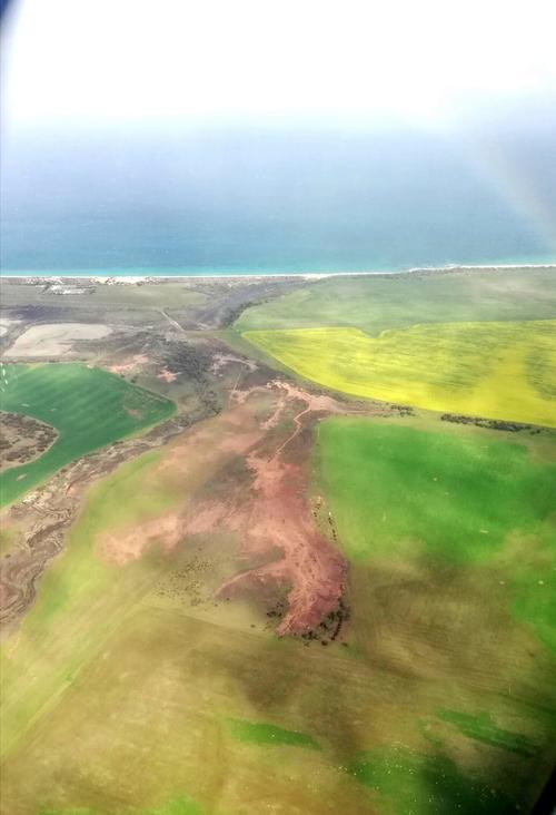 ↓移動中の飛行機で上空から見た菜の花畑(写真右側の黄色の部分)