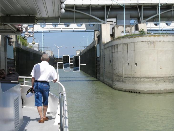 運河より本流の水位が高いので、水門での調整にしばらく時間がかかります。