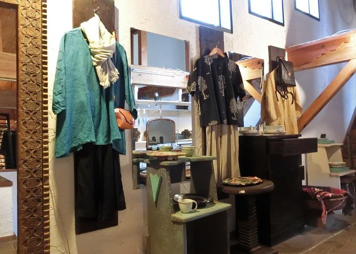 反対側の2階の部屋には、手染めの布製品などが並んでいます。