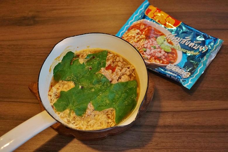 知人のタイ人曰く、青色のパッケージ(写真右上)のインスタントラーメンが一番お薦めとのこと。大抵、どこのお店にも置いてあるので、購入しやすい商品でしょう。このインスタントラーメンは、小麦粉から作られた中華麺(タイ語で「バミー」)入。日本のインスタントラーメンの触感に似ており、私も、今のところ、一番好きです。ただ、麺自体に、特有の風味が加わっているのか、お味は、ライムの風味があり、暑い国で食べると爽やかさも感じられます。タイらしいインスタントラーメンのひとつで、お薦めのお土産のひとつにも挙げられるのではないでしょうか。どの袋麺タイプのインスタントラーメンにも共通して言えることですが、通常、袋のパッケージに表示されているようなお肉や野菜等の具は同梱されていませんので、具なしで食べると、結構辛く感じるかもしれません。別に、塩コショウ等で軽く味付けして炒めたひき肉とヤサイカラスウリの葉を最後にトッピングとして追加すると、辛さも和らぎ、私にはちょうど良い感じです。