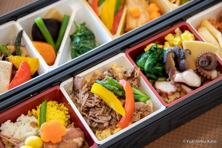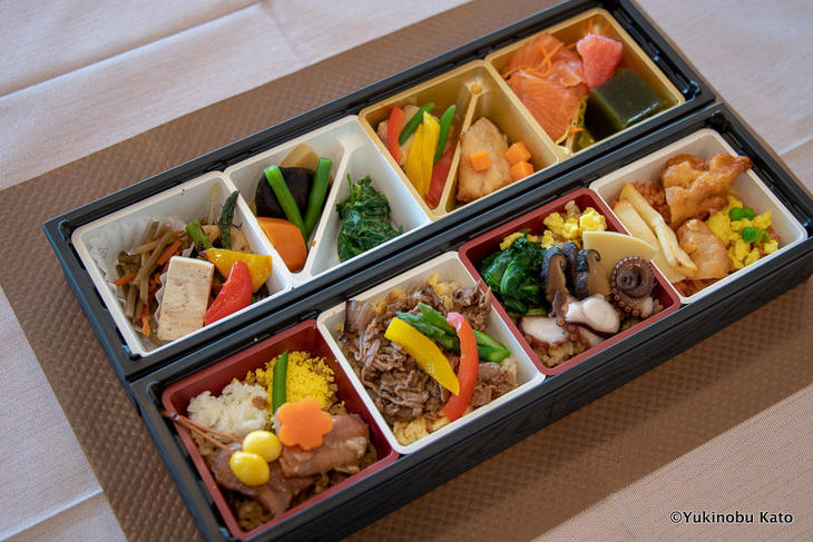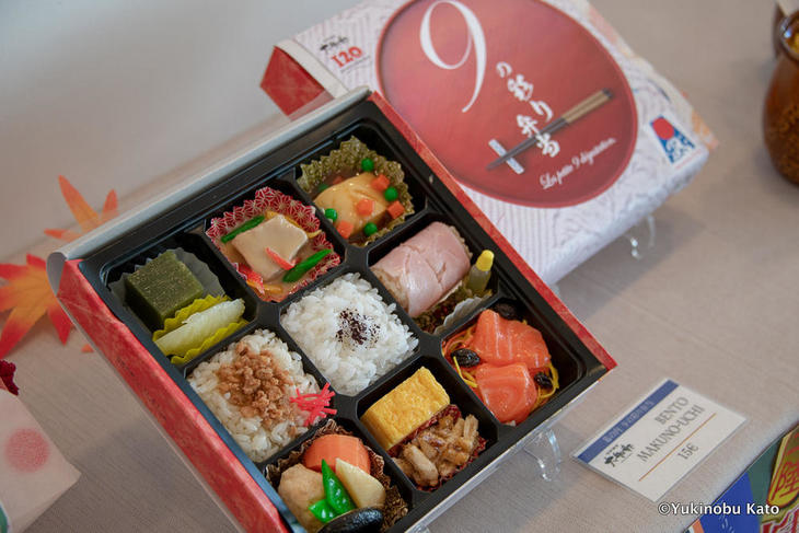 フランス料理のコースに見立て、前菜3種と米飯料理3種、魚料理と肉料理にデザートを付けて、9つに仕切 った折箱に詰めています。駅弁の原点「地産地消」の考えにもとづき、フランスで手に入る食材を使用し、日本風に調理した弁当です。