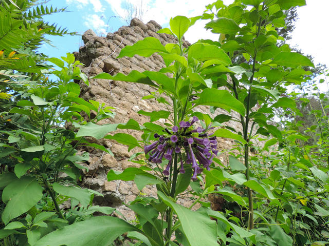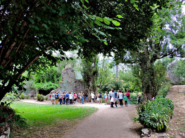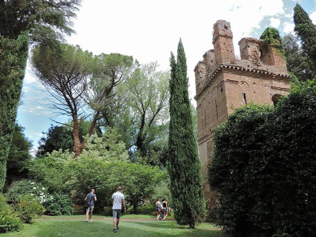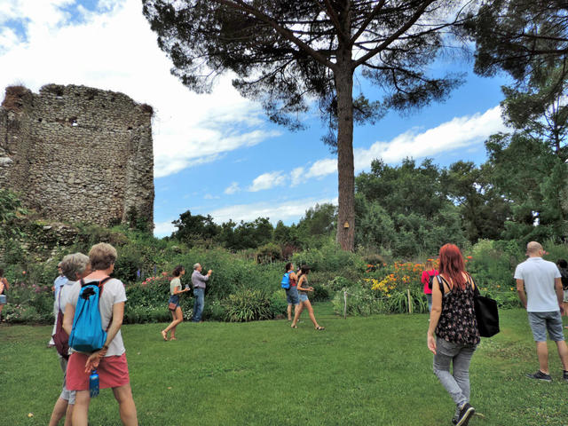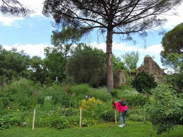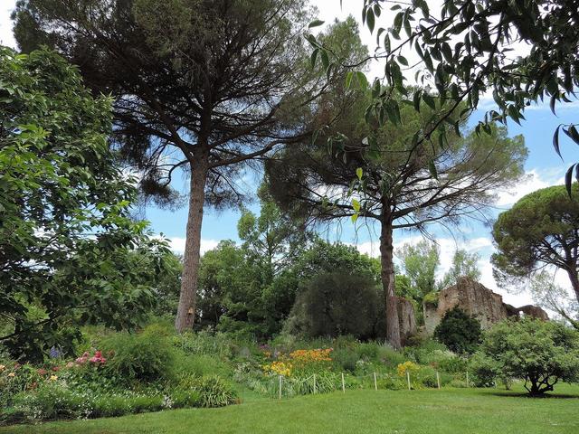 ↑ 自然と遺跡の融合が絵になるニンファの庭園。昔のニンファの町で最も重要な聖堂であった中世のサンタ・マリア・マッジョーレ教会の遺構。遺跡の中には、まるで煙を噴いているかの様な大きなスモークツリーがあります。