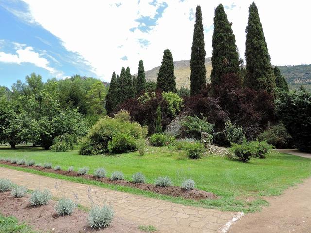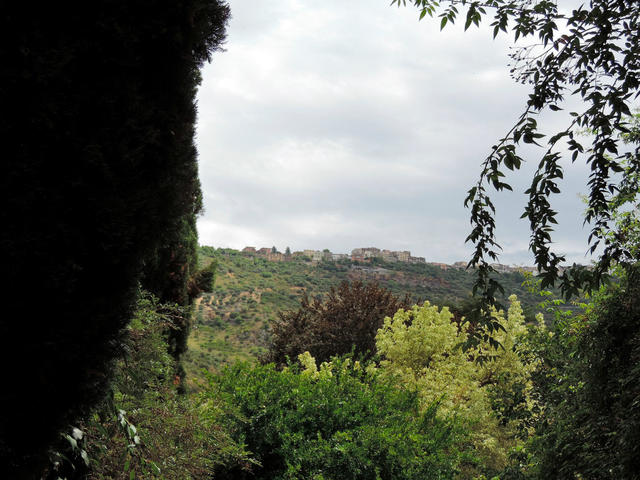 ↑ 今では消滅してしまった中世の町ニンファに1900年代前半に造られたニンファの庭園では、各所からオリーブ畑の丘や、丘の上にそびえる近隣の小さな町の美しい眺めも楽しめます。お城の遺構の向こうに、オリーブ畑の丘の上に広がるノルマ(Norma)の町が見えて来ました。