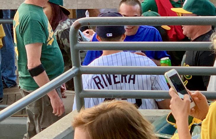 チームを超えたファンが多い元ヤンキースの名投手リベラ(Rivera)のユニフォームを着ていた彼。 係員にゴミ箱に入るように言われてた(苦笑)熱狂的ファンの多いオークランドにおいて今日はかなり勇気ある服装だった(脱帽)