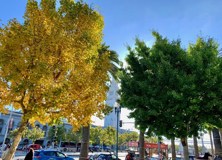 同じイチョウの木なのに紅葉してるのと未だ緑なのがある!