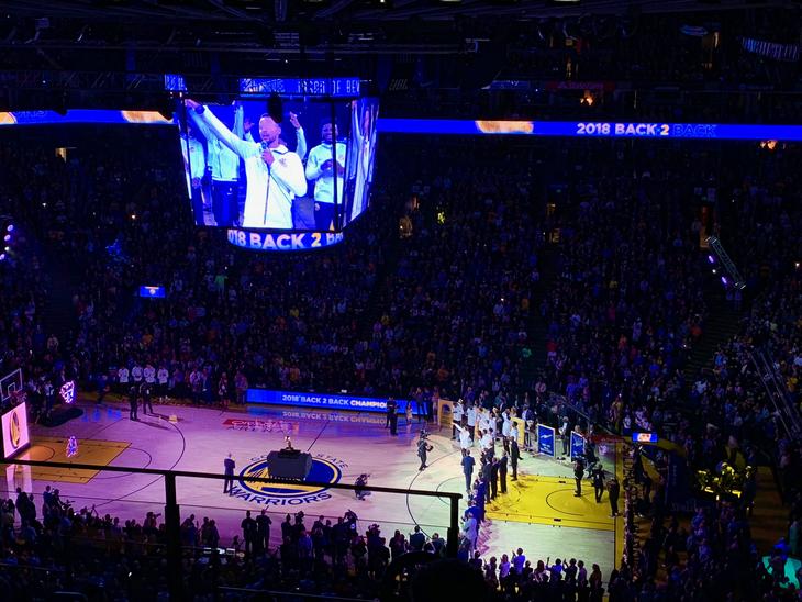 "チャンピオンリング(Championship Ring)" と呼ばれてて、アメリカのメジャースポーツ MLB NFL NBA、カレッジフットボールでシーズン優勝したチームが記念に作る指輪。 NBAは優勝した次のシーズンの最初のホームゲームで行われるんだそうだ。 来シーズンはサンフランシスコの『チェースセンター(Chase Center)』に引っ越すからこれがオークランドでのリングセレモニー の見納めだ。 来シーズンはサンフランシスコでリングセレモニー 見れたらいいなぁ。