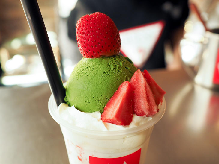 "Frozen Strawberry Gelato Latte(Maccha gelato with fresh strawberries"
