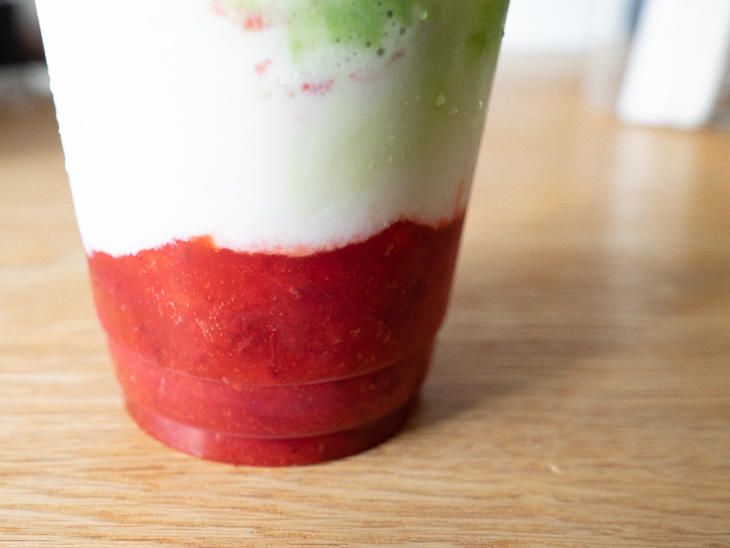 抹茶ジェラートが入った「フローズンストロベリージェラートラテ」(\690)です。