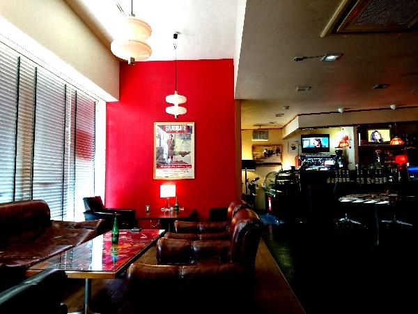 店主が塗った色気のある真っ赤な壁に貼られた映画のポスターやテレビから流れる映像。