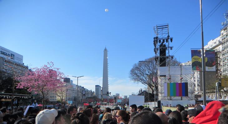 この写真はユースオリンピックがオベリスコという白い塔のある町の中心地で野外で行った開会式前の様子です。