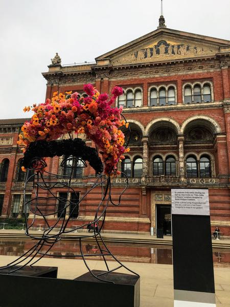 そもそも今回のこの訪問は行く前から既に失敗していて、珍しく本気で行ってみたいと思った展示会であるにも関わらず、事前予約を怠りズルズルと先延ばしにしているうちに、いつの間にかチケットが売り切れになっていたのです。しかし、ホームページを熟読しているうちに、当日券なる物がある事に気付き、それに賭けてわざわざロンドンまで出てきたのです。それなのに・・と、未練タラタラでしたが気を取り直して、関連ショップで思う存分フリーダ グッズを眺め、ポスターも至る所で嫌という程見たり、事前情報で仕入れていた中庭のフリーダ オブジェも無事写真に収め、大分達成感に浸れるようになってきました。「ザ・観てきたつもり」