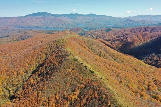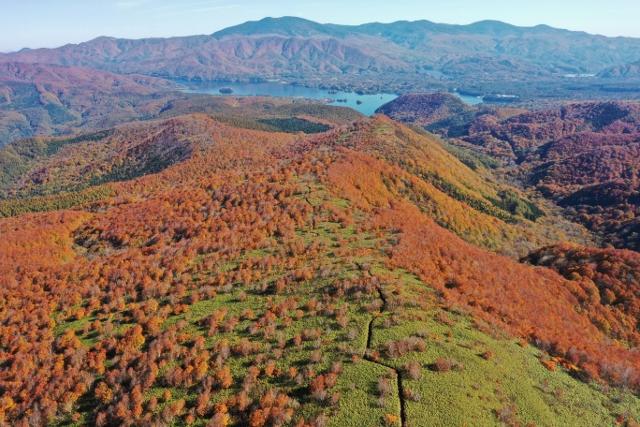雄国山頂から続く稜線の先に桧原湖
