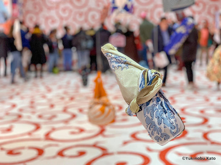 パビリオン内も全面赤の唐草模様。館内には日本とフランスのアーティストやデザイナーによって描かれた風呂敷が並んでいたり、風呂敷の使い方を説明した映像、実際にどうやって風呂敷を使えばいいのかなど、来場者参加型のデモンストレーションが行われています。