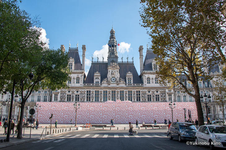 パリ中心部、セーヌ川のすぐ隣に立つパリ市庁舎。その市庁舎前の広場に、巨大な風呂敷のパビリオンが11月6日まで設けられています。「ジャポニスム 2018:響きあう魂」の特別企画の一つとして、建築家・田根剛さんが監修し「東京からパリへの贈り物」としてイメージした「パリ東京文化タンデム2018 FUROSHIKI PARIS」です。パビリオン内では「風呂敷のアート」をテーマに、風呂敷についてのさまざまな展示がされています。